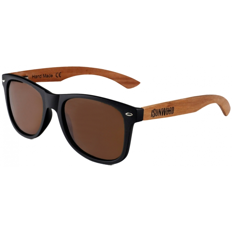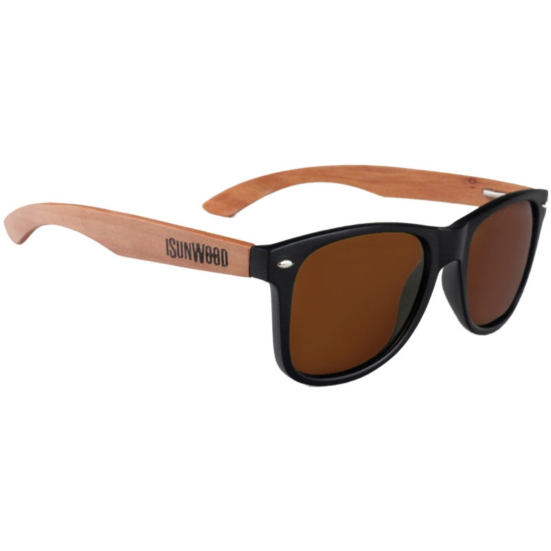 Modelo Spica, corpo preto, pinos de madeira e lentes polarizadas em efeito madeira marrom.