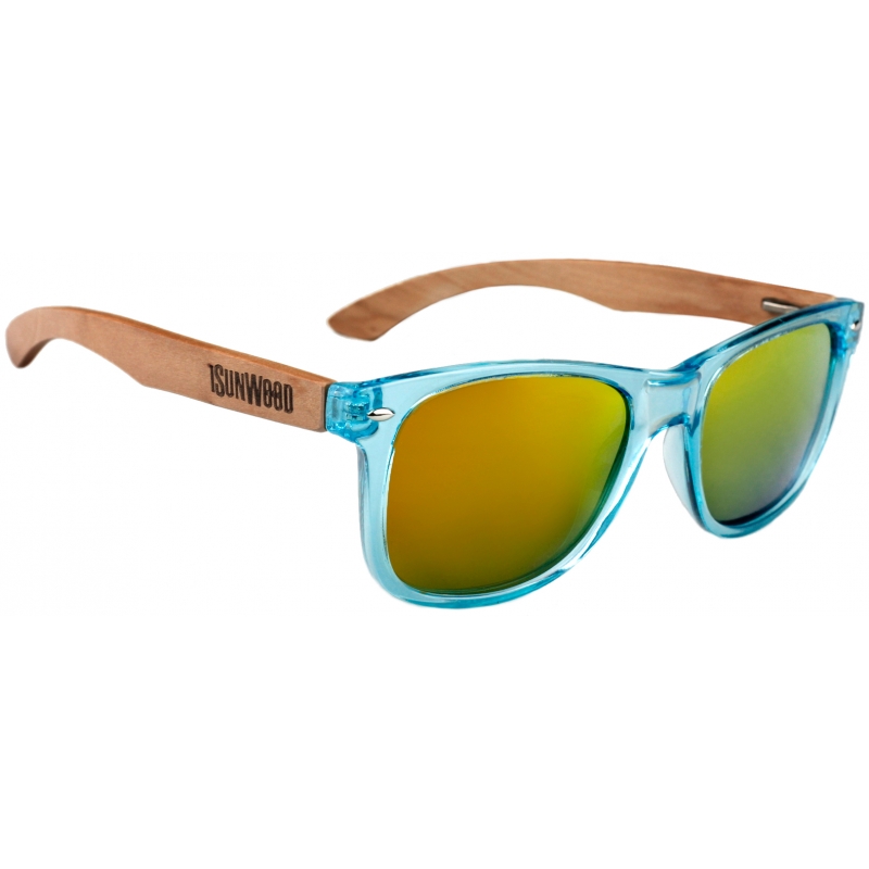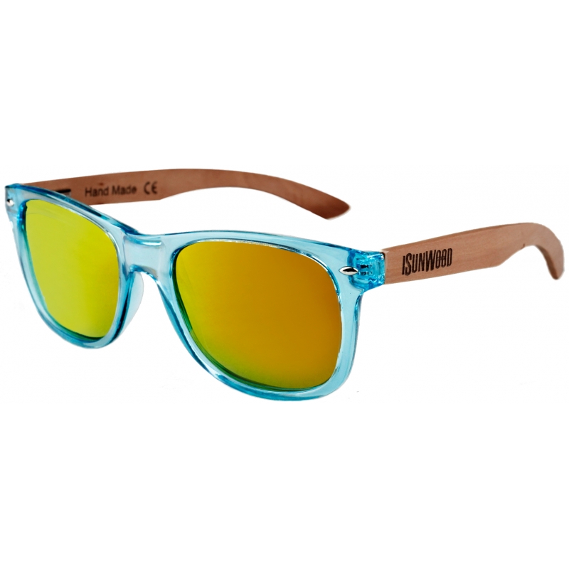 Modelo de Mensa, corpo azul translúcido, pinos de madeira e lentes polarizadas espelho efeito em combustível de dourados.