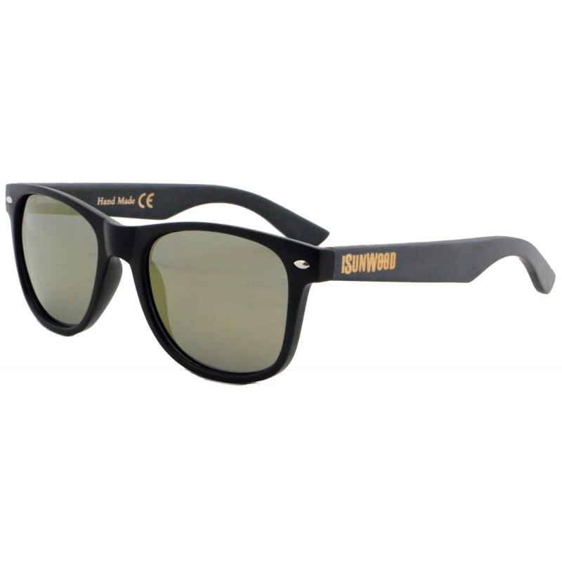 Modelo Taus, corpo preto, pinos de madeira e efeito de espelho de lentes polarizadas na cor dourada.