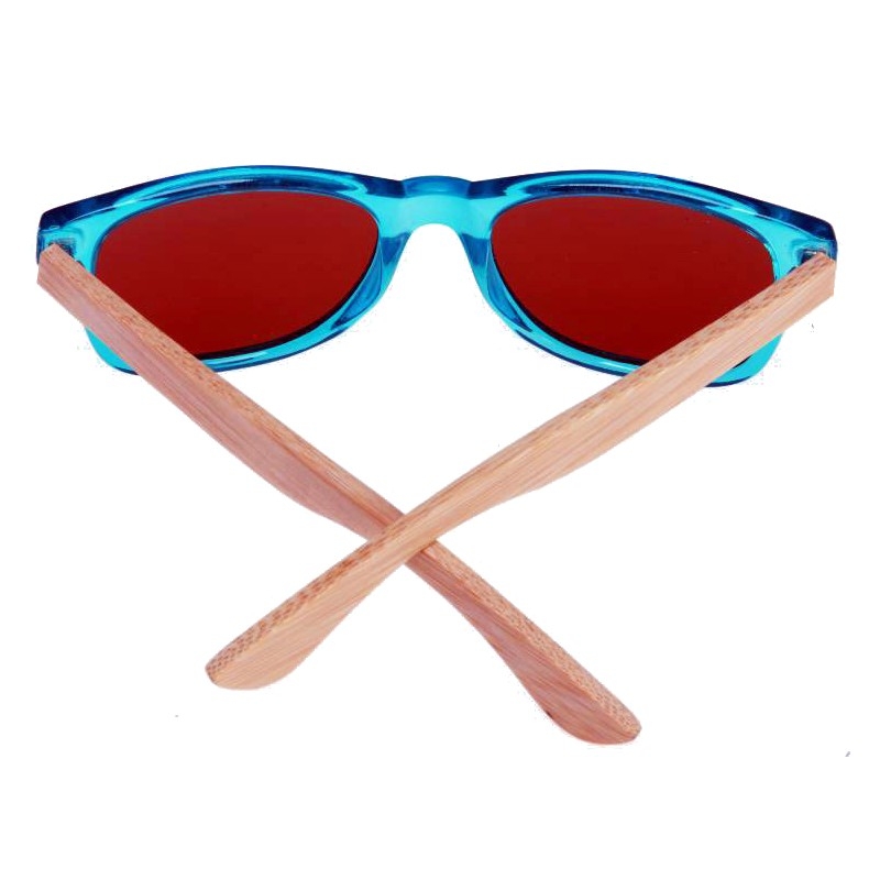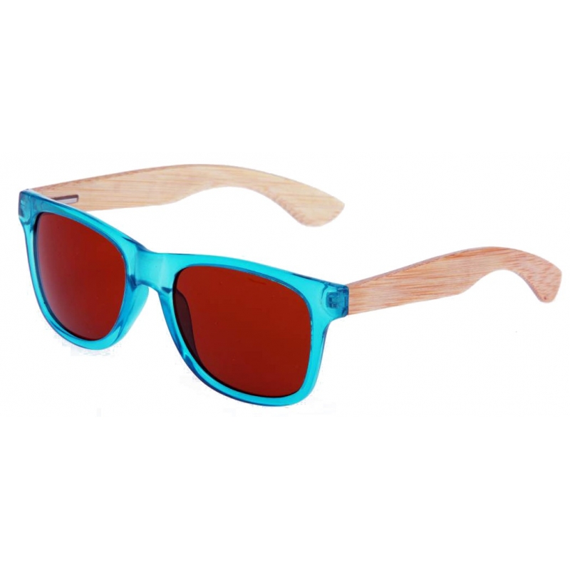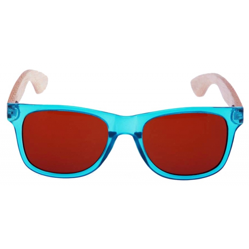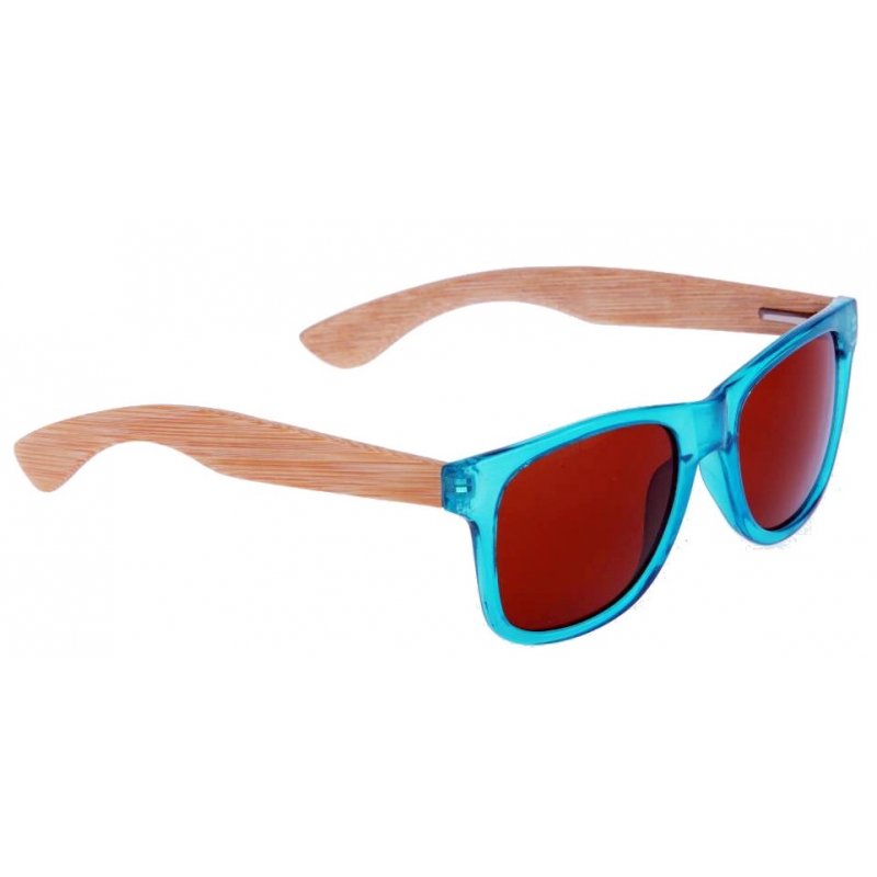 Modelo Vega, cuerpo en color "azul translucido", patillas en madera de Bamboo y cristal en tono "marrón".