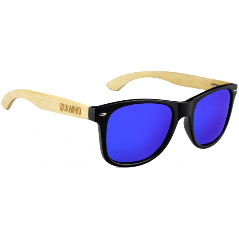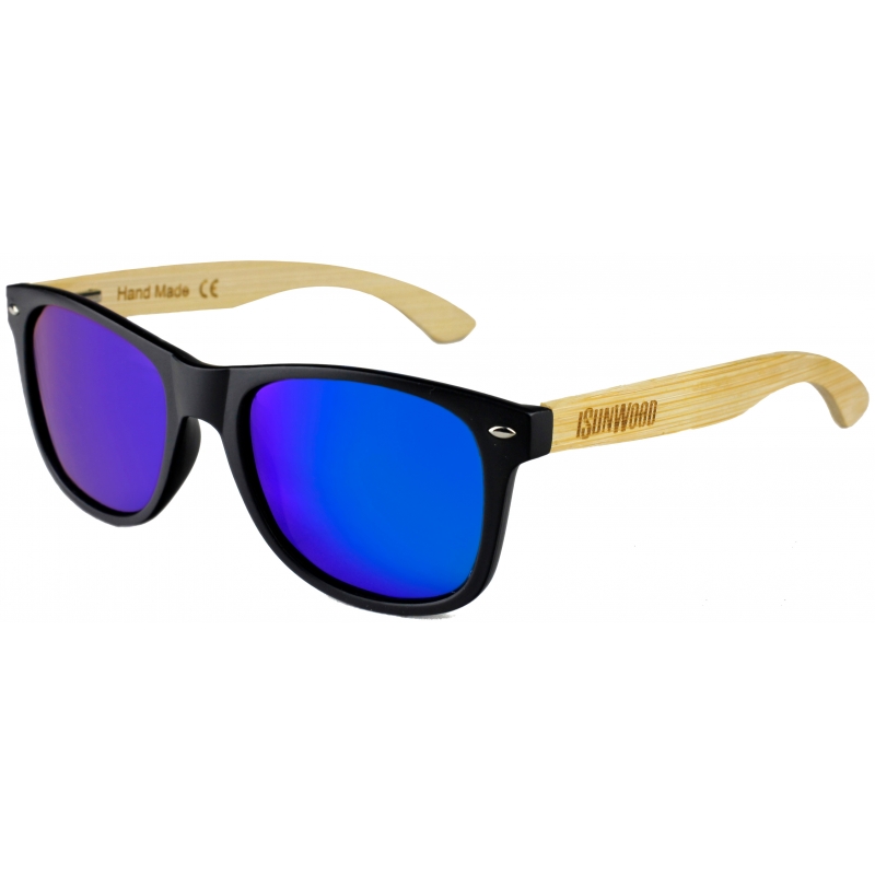 Modelo Mizar, cuerpo negro, patillas en madera de Bamboo y lentes Polarizadas efecto espejo en color azul.