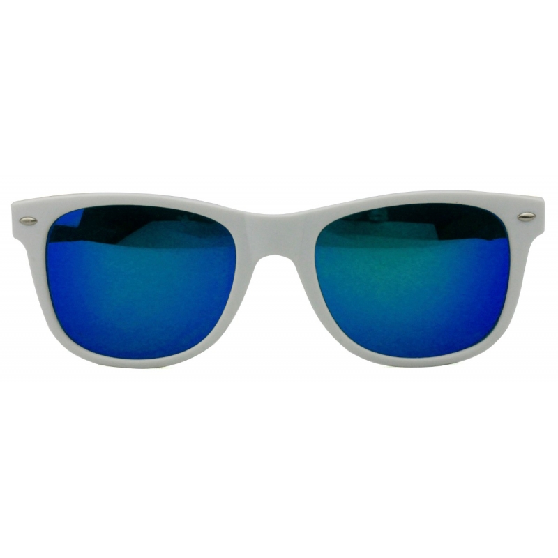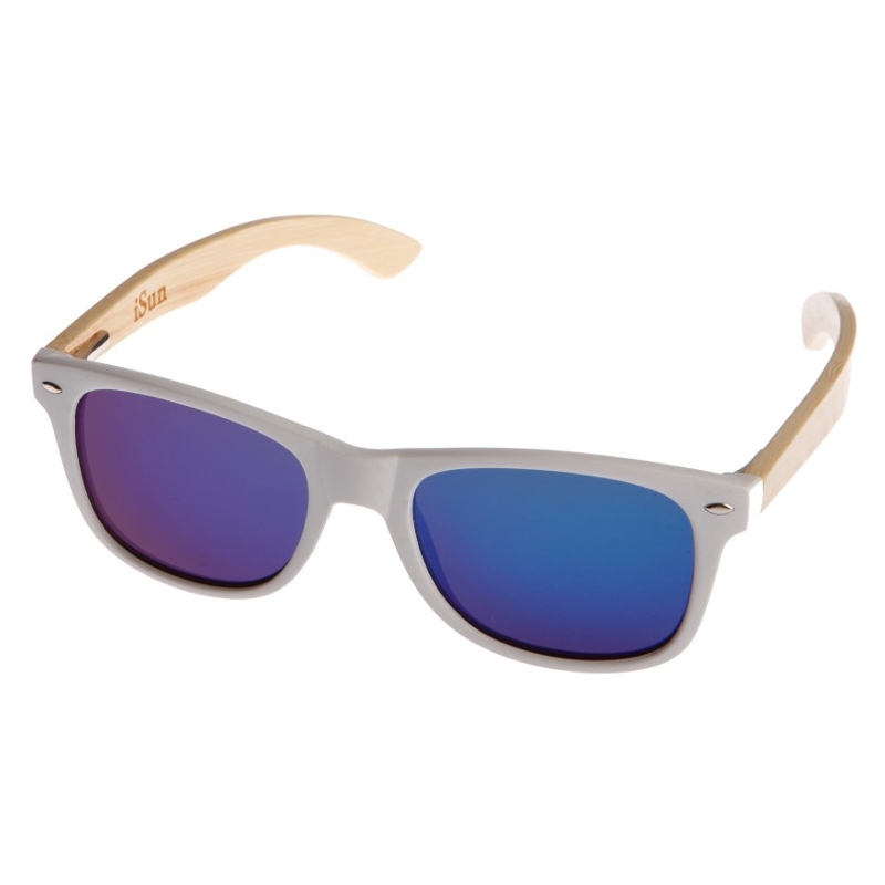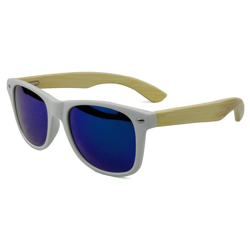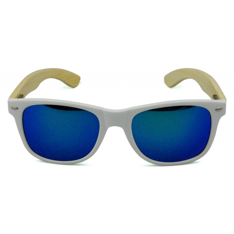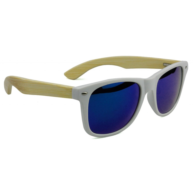 Modelo Altair, cuerpo en color blanco, con lentes Polarizadas efecto espejo azul y patillas en madera de Bamboo.