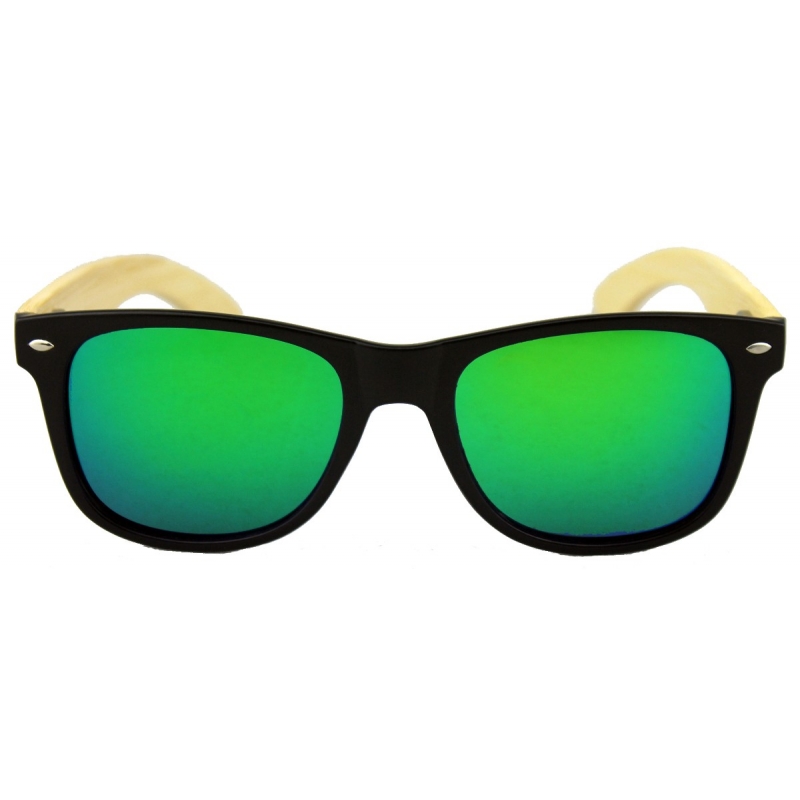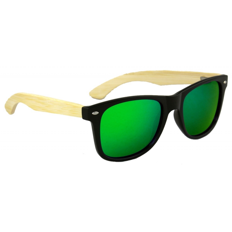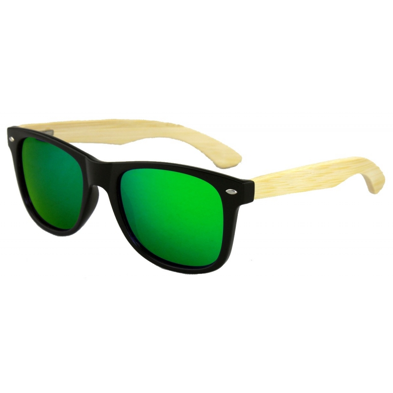 Modelo Kappa, cuerpo negro, patillas en madera de Bamboo y lentes Polarizadas efecto espejo en color verde.