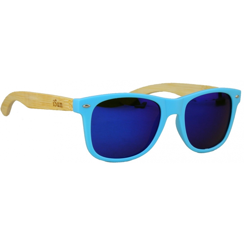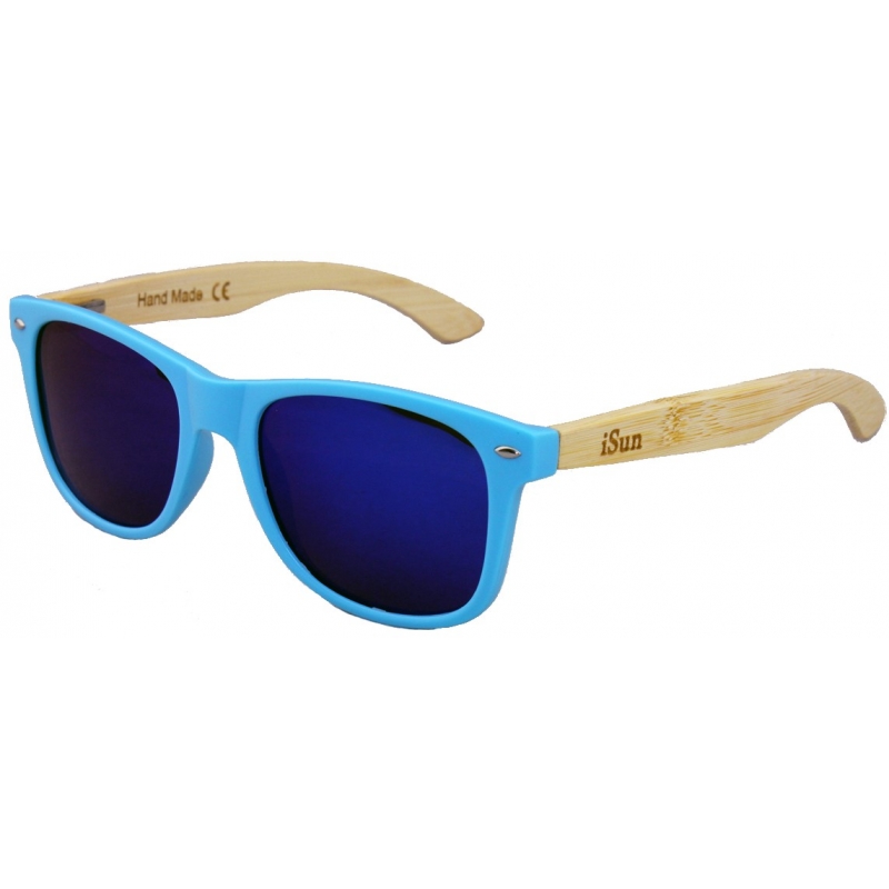 Modelo Heka, cuerpo en color "azul celeste", patillas en madera de Bamboo y lentes Polarizadas efecto espejo en color azul.
