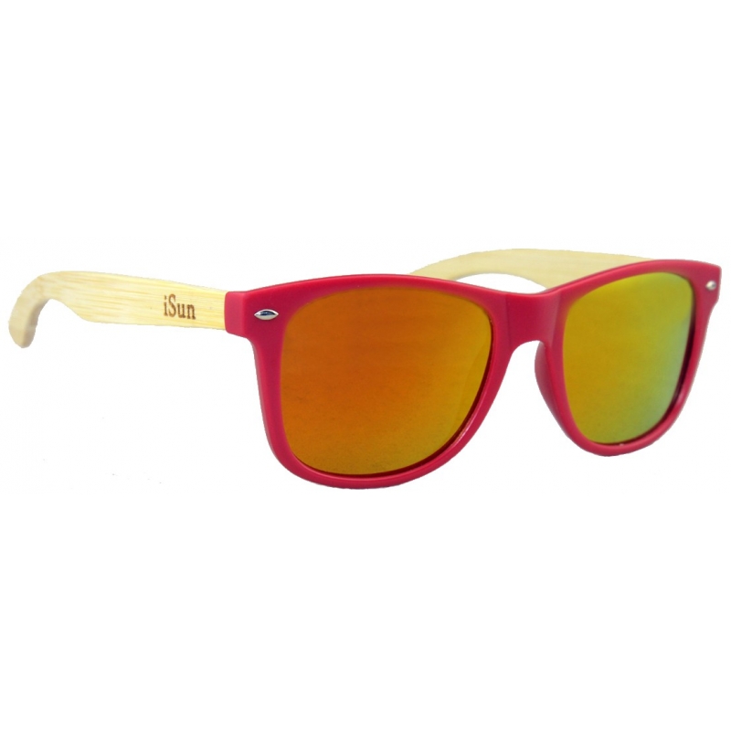 Modelo Rotja, cuerpo rojo vintage, patillas en madera de Bamboo y lentes Polarizadas en color dorado fuel.