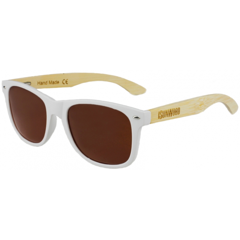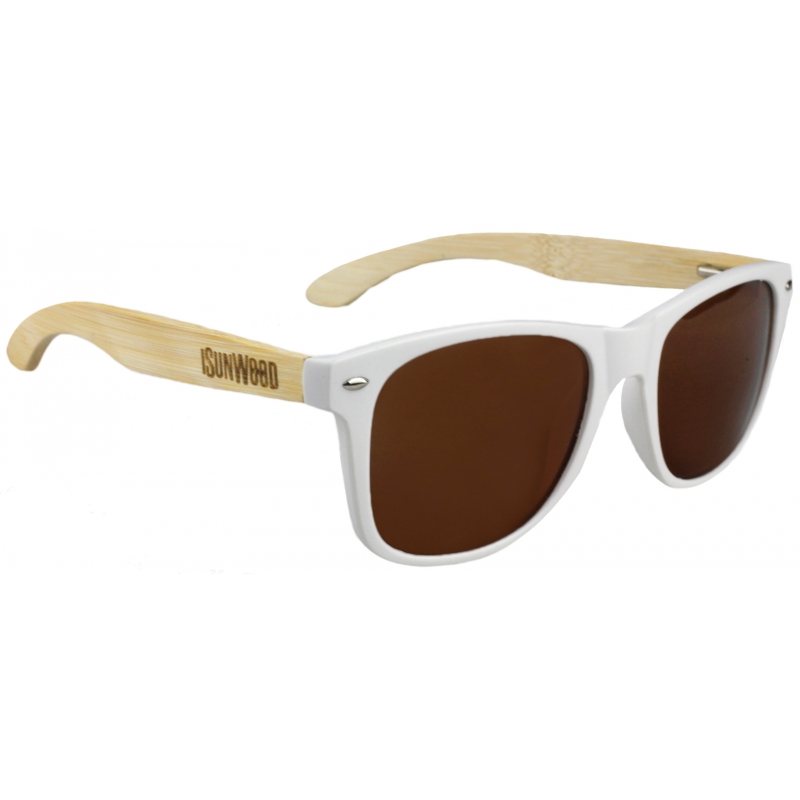 Modelo Baix, cuerpo blanco, patillas en madera de Bamboo y lentes Polarizadas en color marrón vintage.