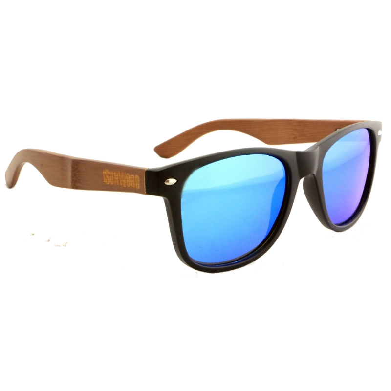 Modèle Acrux, corps noir, chevilles en bois et verres polarisés bleu effet de miroir.