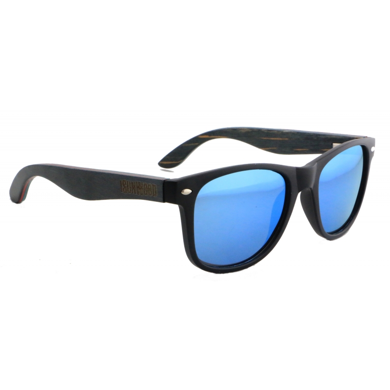 Modèle de corps de grue, noir, pin bois tropical-trois-couche et effet miroir bleu lentilles polarisées.